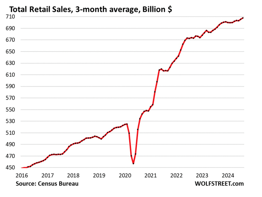 Wolf Richter says it’s remarkable that retail sales continue to rise even as the prices of many goods have been dropping all year. When prices fall and consumers buy the same amount of stuff, retail sales should decline. If sales are increasing but the prices of goods are falling, it means consumers are buying more stuff, particularly durable goods.
