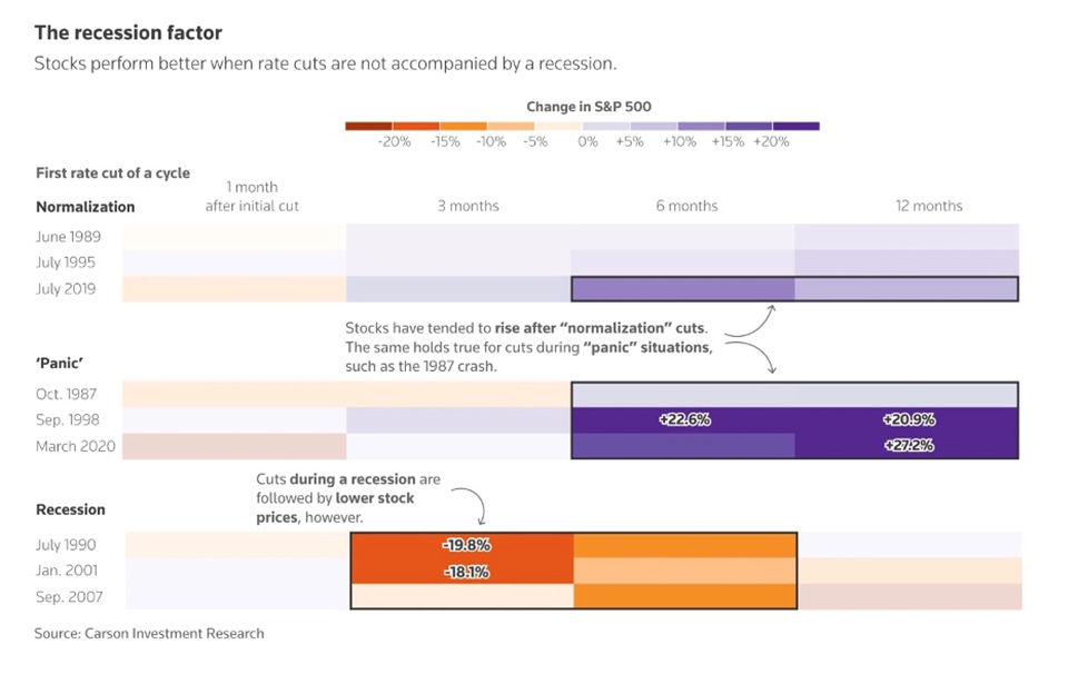 Naturally, how the stock market does depends on whether or not the economy falls into a recession following the rate cut.