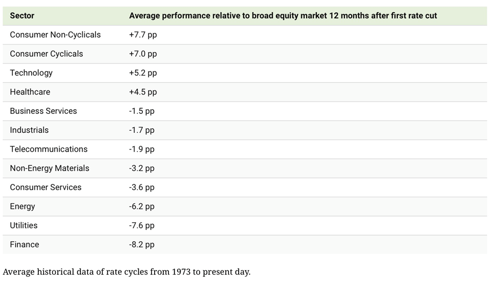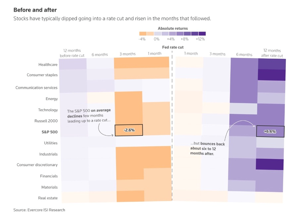 Among S&P 500 sectors, consumer staples and consumer discretionary had the best average performance, both rising around 14% a year after the cut, while healthcare rose roughly 12% and technology gained nearly 8%, according to Evercore.