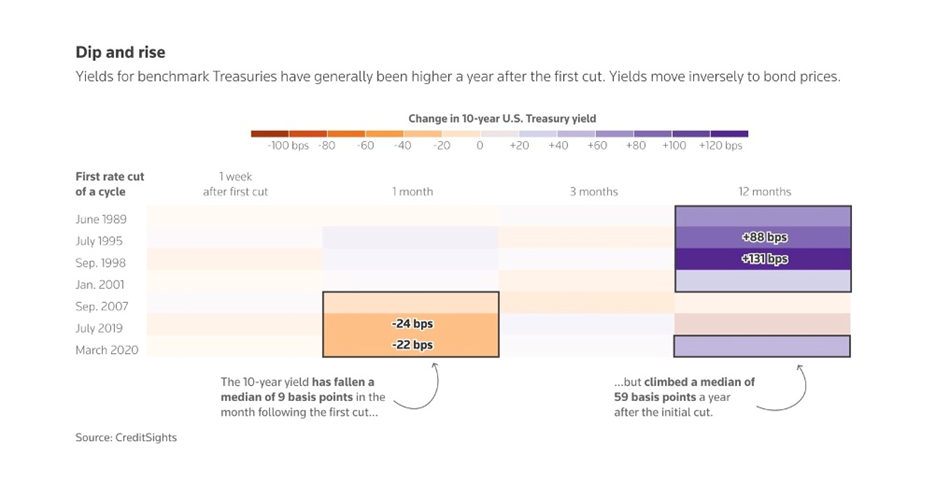 Reuters notes the 10-year yield has fallen a median nine basis points in the month following the first cut in the last 10 rate-cutting cycles and climbed a median 59 basis points a year after the initial cut as investors begin to price an economic recovery, data from CreditSights showed.
