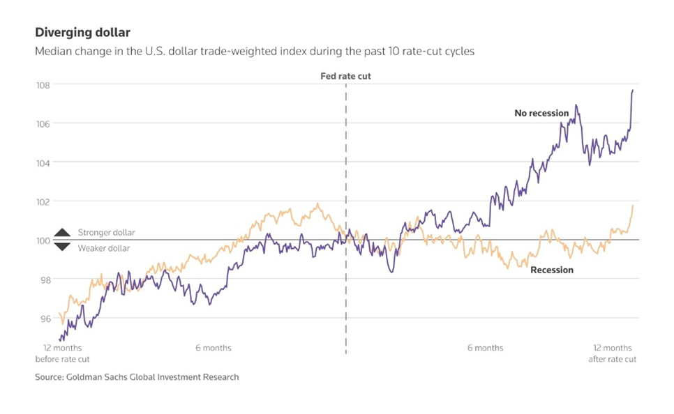 An analysis by Goldman Sachs quoted by Reuters found that the greenback strengthened a median 7.7% against a basket of currencies after the first rate cut when the economy was not in recession. The data is based on 10 prior cutting cycles. In fact the dollar even gained when the economy was in recession, by 1.8%.
