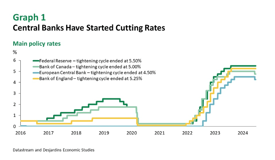The first two graphs show that central banks had already started cutting rates in June, with their tightening cycles ending at about 5.0%.