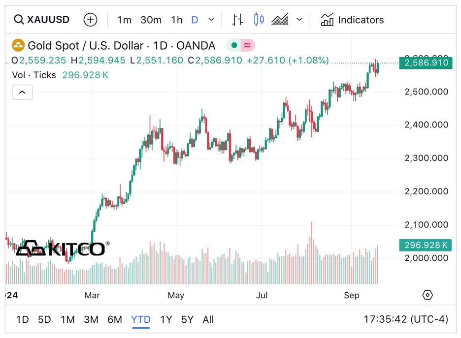 The gold price hit a fresh record-high $2,590.47 in mid-day trading Thursday, with investors reacting to the 50-bp cut the day before. Gold has an inverse relationship to interest rates. As rates go lower, gold typically gains in price. The precious metal is up 25% so far this year.