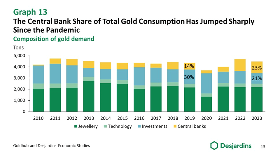 In 2023, 4,448 tonnes of gold demand minus 3,644t of gold mine production left a deficit of 804t. Only by recycling 1,237t of gold jewelry could the demand be met. (The World Gold Council: ‘Gold Demand Trends Full Year 2023’)