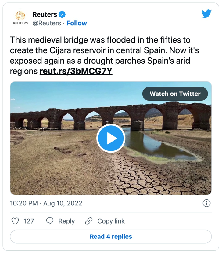 The drought too has worsened Europe’s energy crisis, brought about by cuts to Russian natural gas shipments owing to the war in Ukraine. According to the BBC, low water levels have caused hydropower generation in Spain to drop by 44%, and 20% overall. Some nuclear power plants in France have had to reduce output because rivers have been too low and warm to cool the plants.