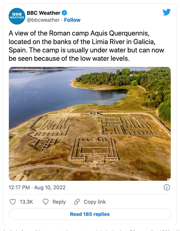 The hunger stones last emerged during Europe’s 2018 drought, and this year the same phenomenon is happening. Only it’s not just rocks that are showing up in the receding waters, but the remains of ancient buildings/ relics/ infrastructure, World War II-era ships and bombs, and in the southwestern US, the macabre discovery of dead bodies.