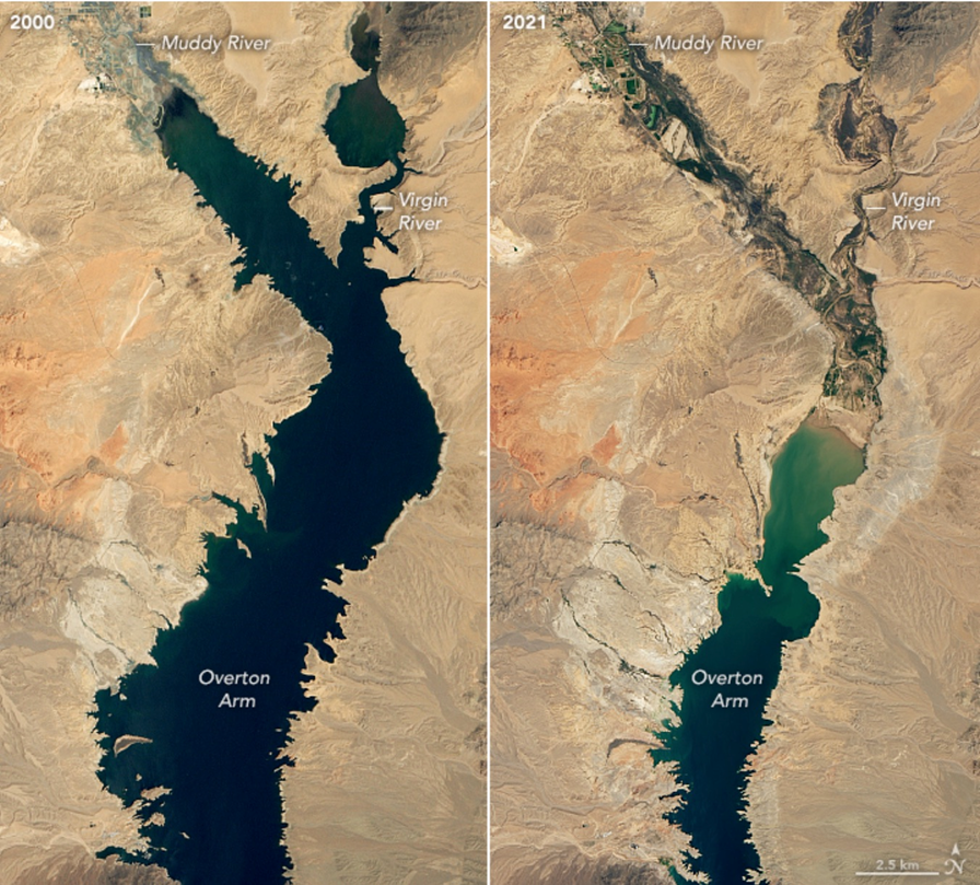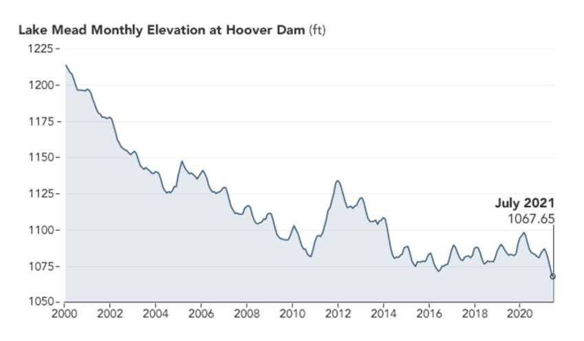 According to NASA Earth Observatory, at the end of July the elevation at Hoover Dam was 325 meters above sea level, the lowest since April 1937 when the lake was still being filled. This is 40 meters lower than at the end of July 2000.