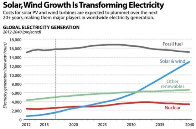By 2040, 34% of worldwide electricity will come from wind and solar and 72% of the $10.2 trillion spent on new power generation worldwide to 2040 will be invested in new wind and solar PV plants.