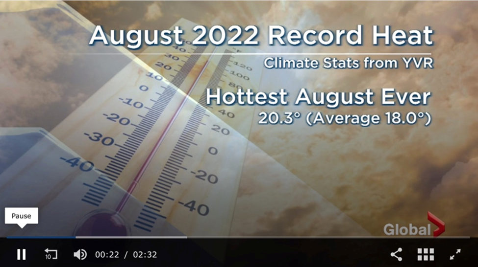 Global News reported that August 2022 was the warmest ever in BC, and the province’s second-hottest month.