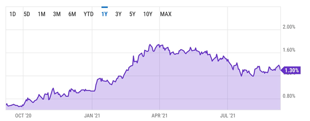 The current 10-year Treasury note yields 1.3% and the July CPI rate of inflation is 5.4%, making real interest rates -4.1% — an ideal environment for gold prices to prosper.