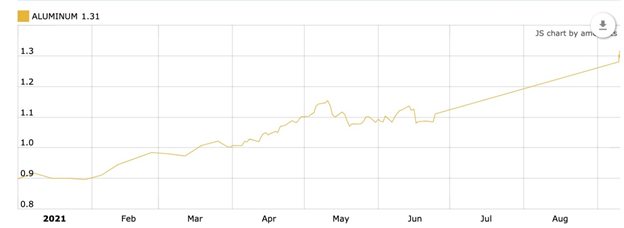 The problem with this substitution strategy? Aluminum prices are skyrocketing, too. A coup in Guinea this week fueled concerns over shortages, pushing the lightweight metal to the highest in more than a decade, at $1.32/lb.