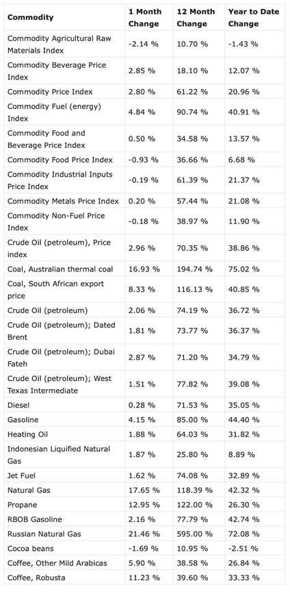 The table below shows commodity price movements over the past 12 months, with all but a handful increasing, some by wide margins. Among the best performers, Australian thermal coal and Russian natural gas top the list, at a respective +75.02% and +72.08% year to date, followed by gasoline (+44.4%), natural gas (42.3%), South African coal (+40.85%), and WTI crude oil (39.08%).