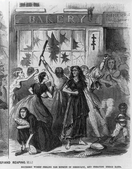 Richmond Bread Riot, 1863 — Food deprivation during the American Civil War was the cause of this, the largest civil disturbance in the Confederacy during the war, in Richmond, Virginia, on April 2, 1863. A Union blockade of Confederate ports prevented food from being imported from other countries. Also, less food was being grown because of the war. As food became scarcer, prices jumped. Encyclopedia Britannica describes what happened on April 2: