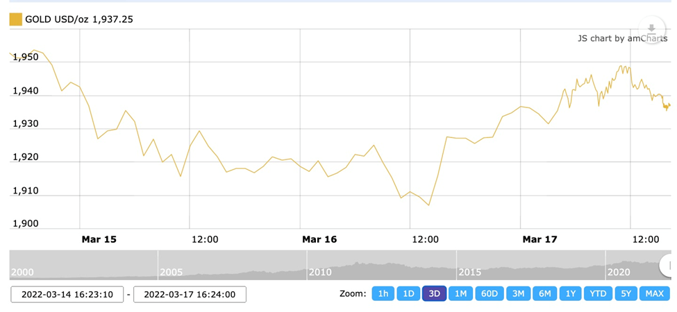 Gold has performed remarkably well in recent days despite the rate hike on Wednesday which was widely expected to dent’s bullion’s appeal among safe-haven investors looking for a yield amid poor stock market performance associated with the war in Ukraine.