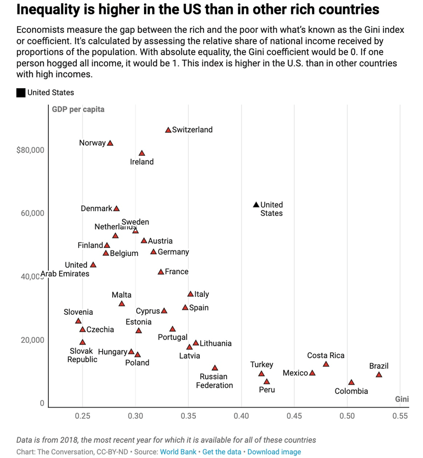 Inequality tends to be greater in developing countries than developed ones. The exception is the United States, which in 2021 had a Gini coefficient of 0.494, 1.2% higher than 0.488 a year earlier. The US Gini is quite a bit higher than Denmark’s, which stood at 0.28 in 2019, and France, whose Gini was 0.32 in 2018, according to Census Bureau data.