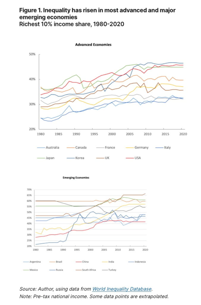 The institution agrees with The Conversation in that wealth inequality within countries is typically much higher than income inequality, following a rising trend since about 1980. Another common finding between the two sources is that the increase in inequality is especially marked at the top of the income distribution, with the share of income among the top 10% and 1% rising sharply.
