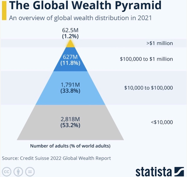 At the bottom of the pyramid, 2.8 billion people share a combined wealth of $5 trillion, an amount representing only 1.1% of the global wealth total.