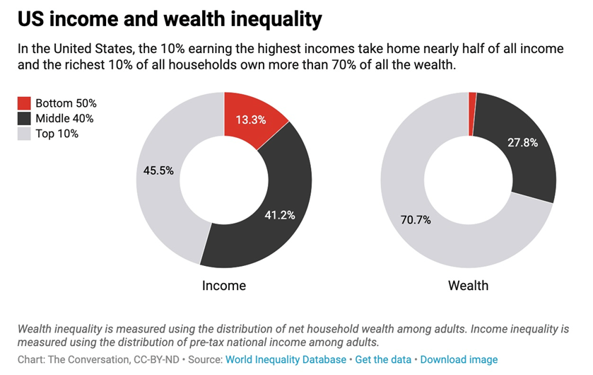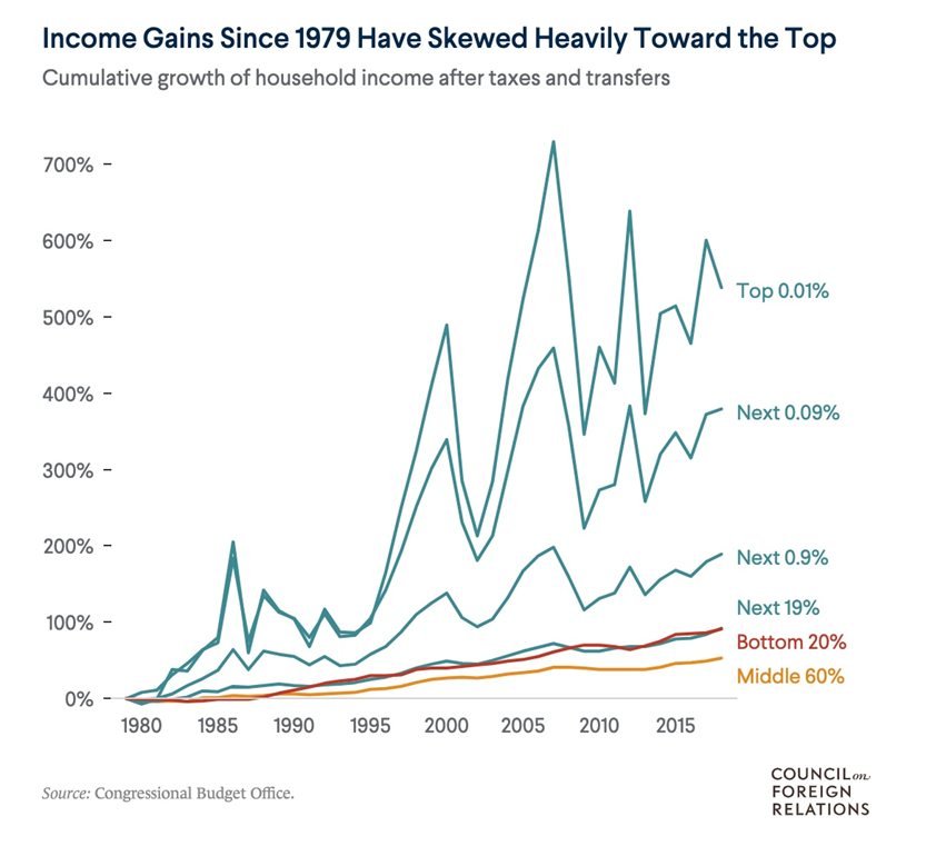 According to the Congressional Budget Office (CBO), inequality has been rising for decades, with the incomes of the highest echelon of earners rapidly outpacing the rest of the population. (Council on Foreign Relations, April 20, 2022). The 10% earning the highest incomes now take home nearly half of all income.