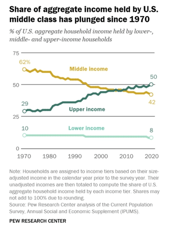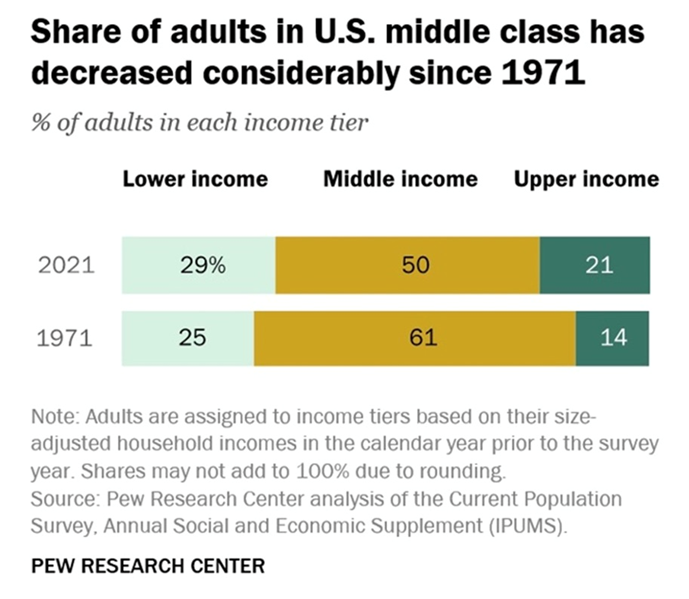 A 2021 Pew Research Center report found that 50% of American adults lived in middle-income households, down from 61% in 1971. This stat is alarming because the middle class has historically been the engine of American economic growth and prosperity, yet over the past five decades it has shrunk.