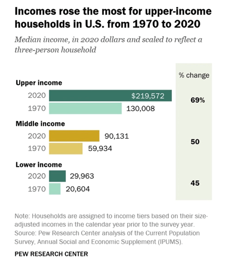 According to Pew, the median income for lower-income households grew slower than that of middle-class households, increasing from $20,604 in 1970 to $29,963 in 2020. The rise in income from 1970 to 2020 was steepest for upper-income households. Their median income increased 69% during that time span, from $130,008 to $219,572. In 2020, the median income of upper-income households was 7.3 times that of lower-income households, up from 6.3x in 1970.
