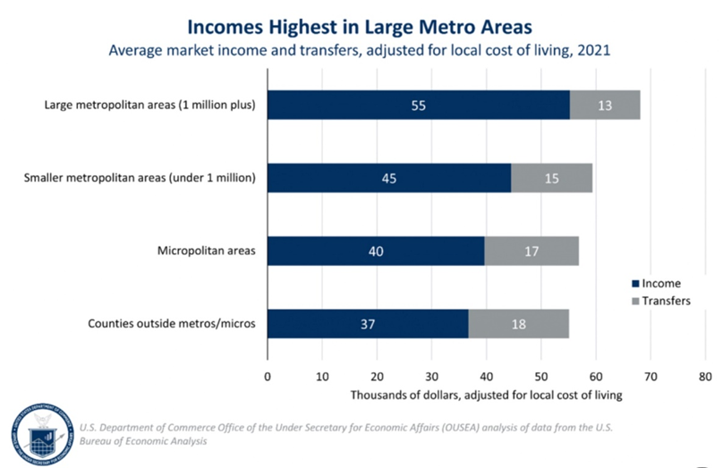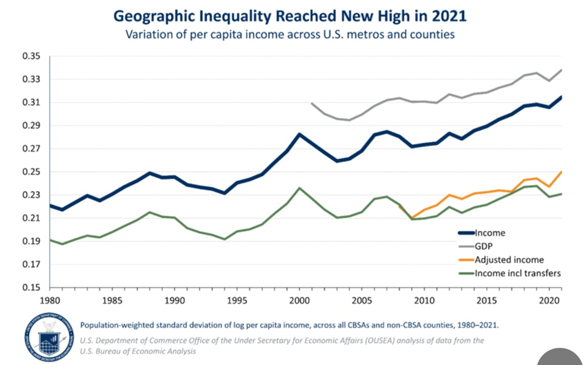 A less-studied but interesting phenomenon is how inequality has manifested in different parts of the country. According to the U.S. Department of Commerce, geographic income inequality — the variation in average income across America — has gone up 40% between 1980 and 2021.