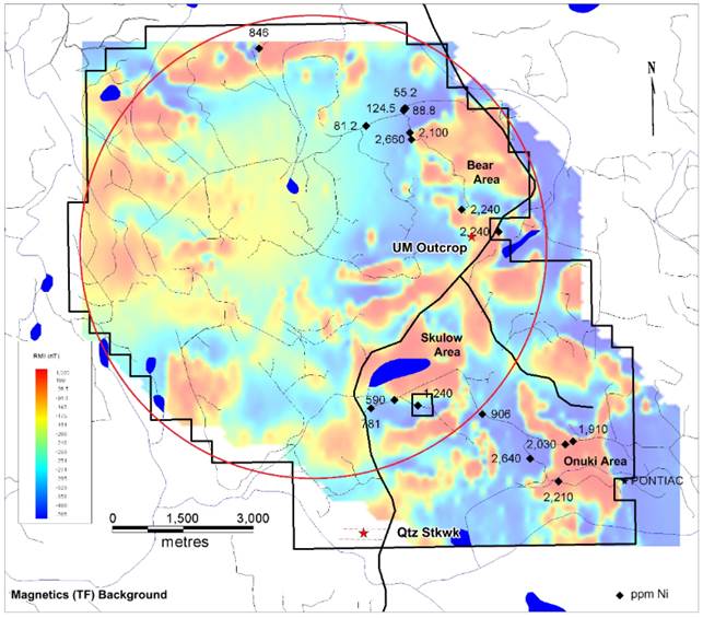 An airborne survey in 2014 delineated an 8-km, ring-like anomaly and at least three other strong magnetic anomalies over 2 km long. Those areas – Bear, Skulow and Onuki – revealed 17 rock samples chipped from outcroppings containing 0.27% nickel. “Exploration demonstrates the Lynx property shows potential for several very large, bulk-tonnage nickel deposits,” states Inomin.
