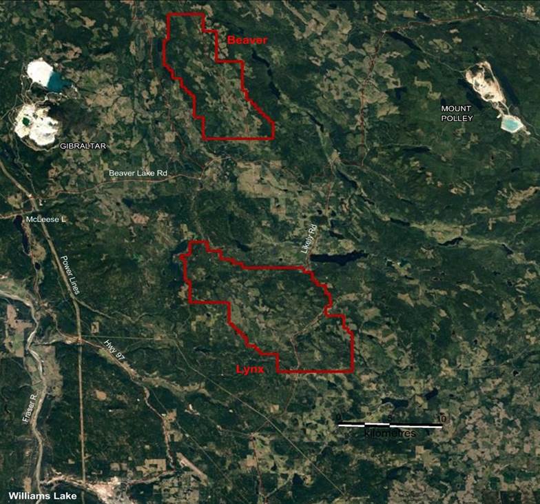 In fact the 7,528 hectare Beaver and 12,662 hectare Lynx are located smack dab in the middle between two major BC mines overlying world-class porphyry deposits – Taseko’s Gibraltar mine and Imperial Metals’ Mount Polley. Gibraltar is the second largest open-pit copper mine in Canada.