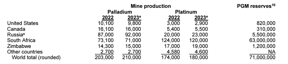 When the war in Ukraine began in February 2022, many reports highlighted how reliant the Western world is on palladium from Russia. As the table below from the USGS shows, 92,000 kilograms of palladium were mined by Russia in 2023, higher than second-place South Africa’s 71,000 kg, and nearly six times more than Canada’s 16,000 kg.