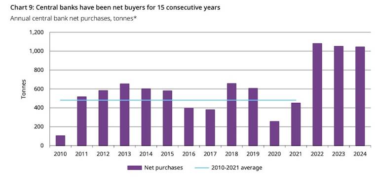 2024 was also the third consecutive year in which gold demand surpassed 1,000 tonnes, far exceeding the 473-tonne average between 2010 and 2021.