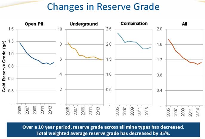 The evidence of high grading, the smoking gun, is revealed in the changes to gold reserve grades over the years. The chart below shows that for both open pit and underground gold mines, and a combination of the two, reserve grades over a 10-year period fell 35%.