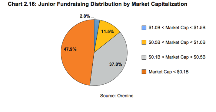However, Oreninc also notes that, between 2011 and 2018, nearly half (47.9%) of all junior funds raised were by companies under $100 million market cap, whereas companies above $500 million market value raised under 15% of the funds.