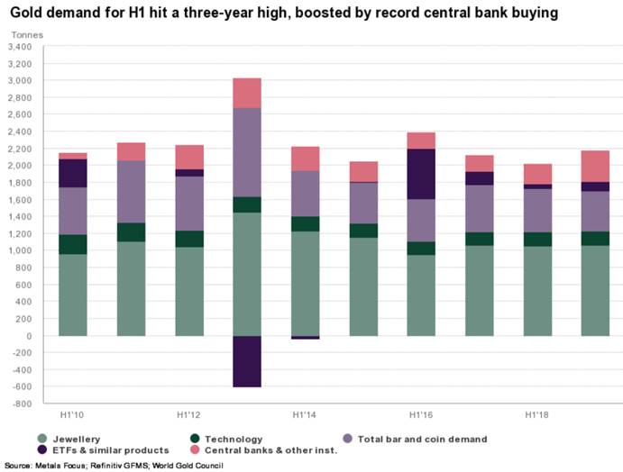 The World Gold Council’s latest report shows gold hitting a three-year high in the first half, lifted by record central bank buying, as central bankers re-position their holdings in reaction to a more dovish global monetary environment. They see Treasury yields slumping and real yields low or negative, so they are backing up the truck for gold.
