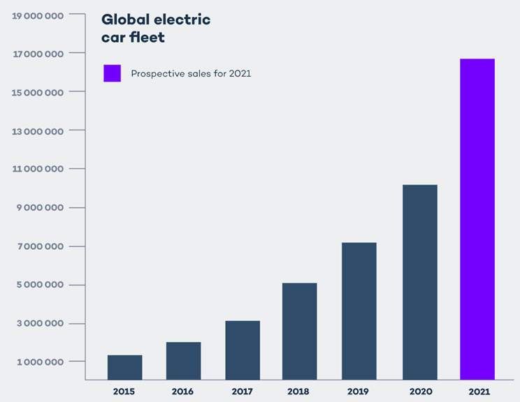 Today, there are at least 15 million cars in the global EV fleet, 6.5 million of which were sold in the last calendar year alone, representing a 109% growth over 2020, according to market research firm Canalys.