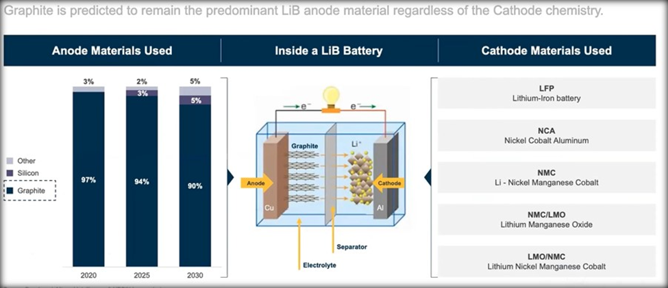 The lithium-ion battery used to power electric vehicles is made of two electrodes — an anode (negative) on one side and a cathode (positive) on the other. At the moment, graphite is the only material that can be used in the anode, and there are no substitutes.