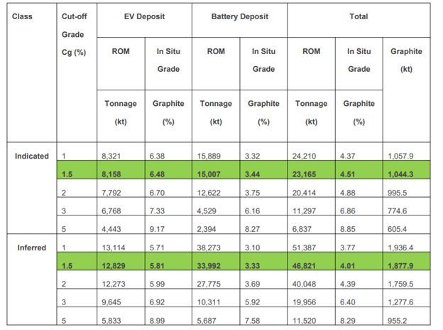 This early-stage study was based on an estimated 23.2Mt of indicated resources grading 4.51% graphite for 1.04Mt contained graphite, plus 46.8Mt of inferred resources grading 4.01% graphite for 1.9Mt of graphite (all based on a cut-off grade of 1.5% Cg).