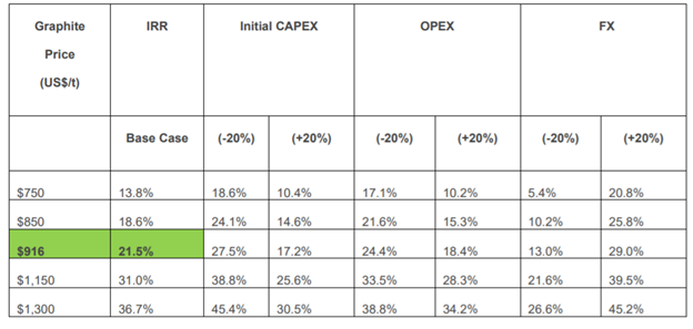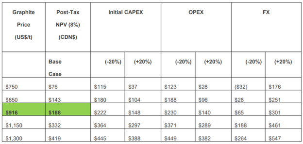 Using a graphite concentrate price of $916/tonne Cg and an 8% discount rate, the PEA established an after-tax net present value (NPV) of C$185.6 million and an internal rate of return (IRR) of 21.5% for the project. Its initial capex could be paid back in just over four years.