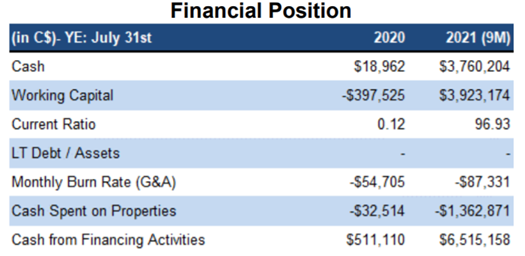 Financially, Lomiko is in good standing with nearly C$3.8 million cash on hand and working capital of C$4 million as of July 31. Outstanding stock options and warrants could bring in another C$4.3 million to the company’s treasury. Its extremely high current ratio (96.9) indicates the company has accumulated a large amount of assets relative to debt.