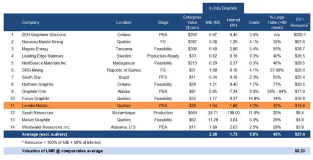 The table below shows LMR and comparable junior resource companies focused on graphite projects. Note that none of the projects are directly comparable, as there are significant variations in the characteristics (flake size, distribution, grade, etc.) of each project.