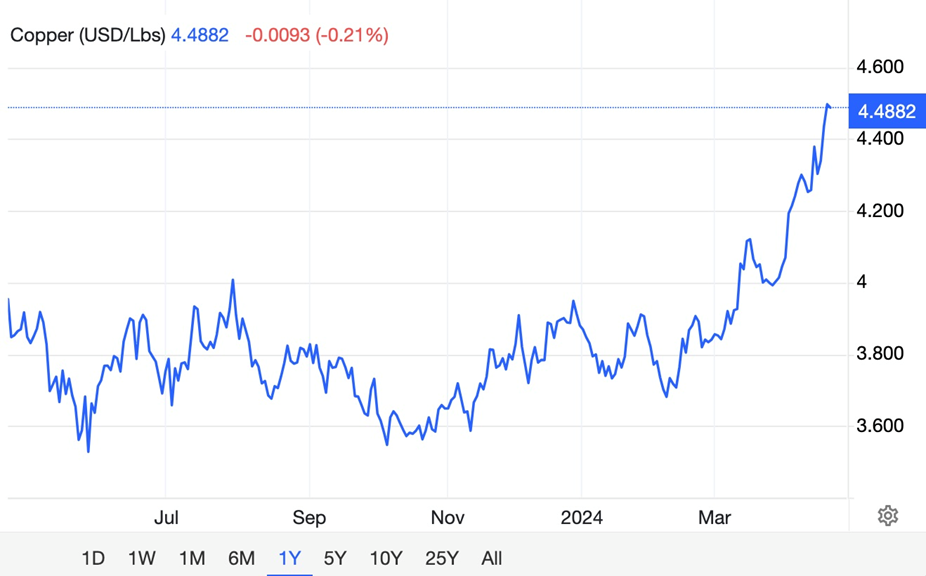 The copper price tickled $4.55 a pound on Monday or $10,000 a tonne, setting a new two-year high, as investors continue to wager that miners will struggle to produce enough red metal to meet demand.
