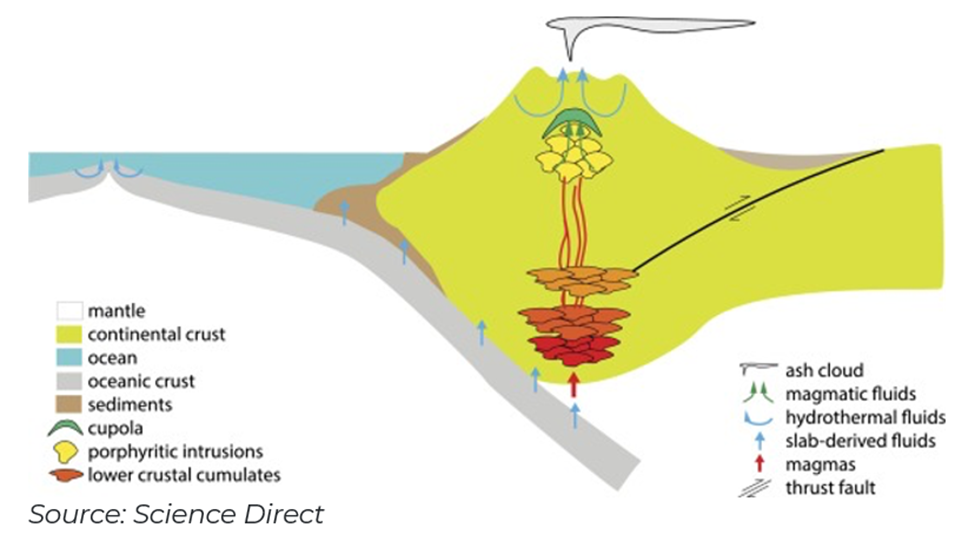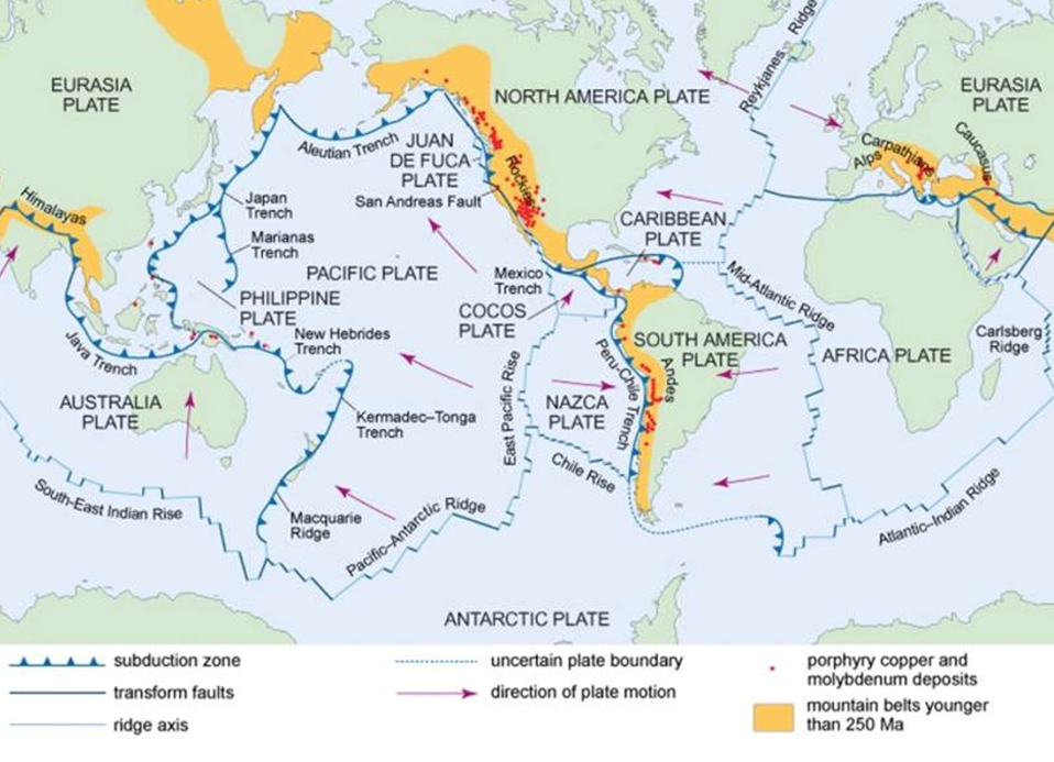 Most porphyry copper deposits occur close to subduction zones around the Ring of Fire — the horseshoe-shaped Pacific Ocean basin where regular and sometimes dangerous earthquakes and volcanic eruptions occur. The Ring of Fire stretches 40,000 kilometers from the southern tip of South America, up the North and South American coasts to the Aleutian Islands, down the East and Southeast coasts of Asia, and ending in a boomerang-shaped arc off the eastern coast of Australia.