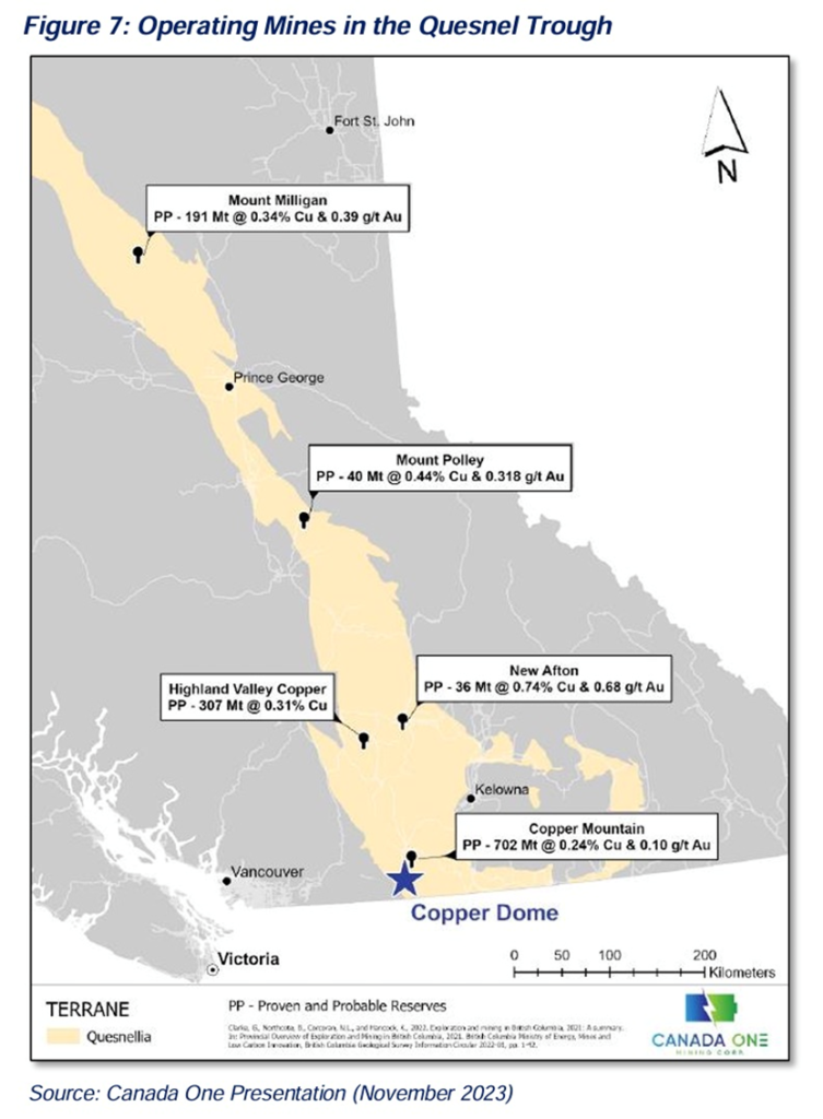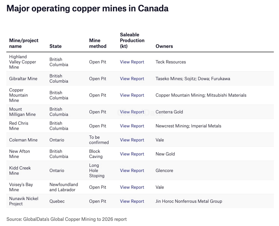 In the table below by GlobalData, via Mining Technology, we note that of 10 major operating copper mines in Canada, six are in BC.