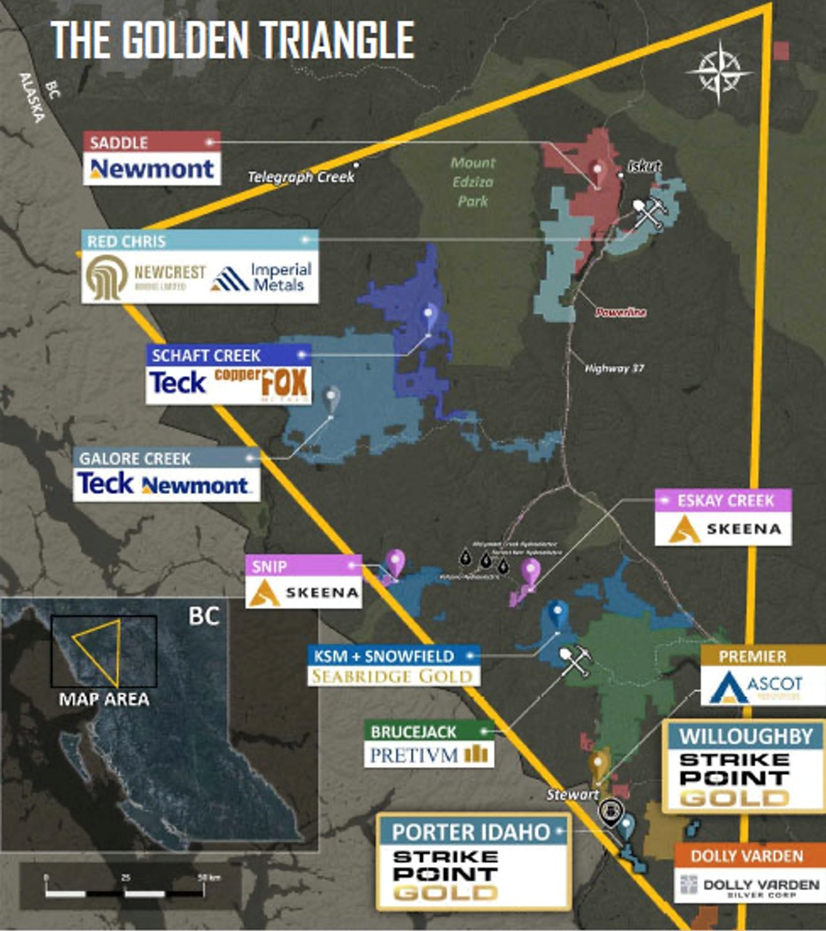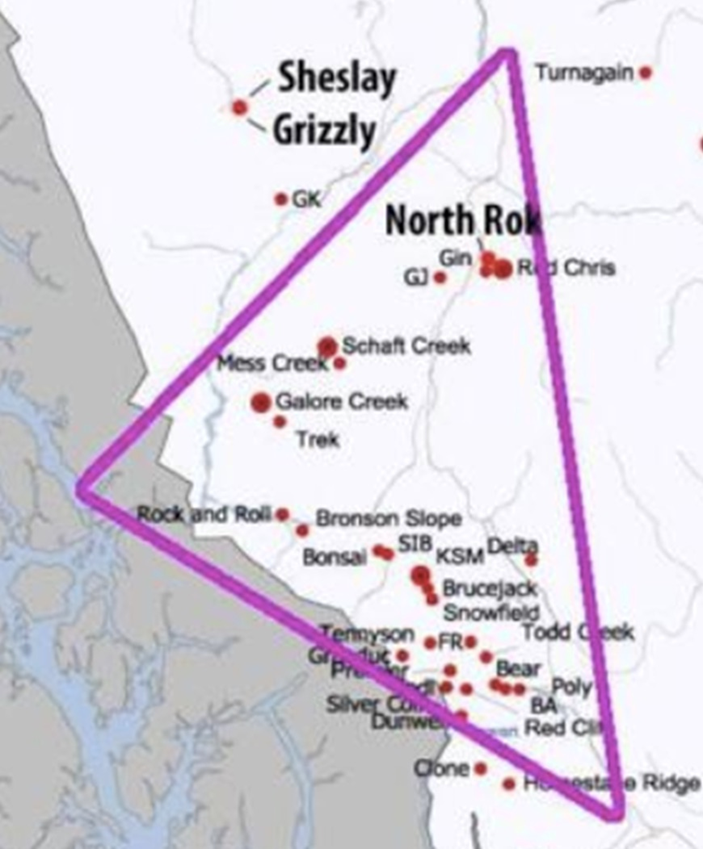 Major porphyry camps and porphyry-related gold deposits within the Golden Triangle include Schaft Creek, Galore Creek, the Red Chris-GJ-North Rok-Tatogga cluster and the KSM-Brucejack-Treaty camps.