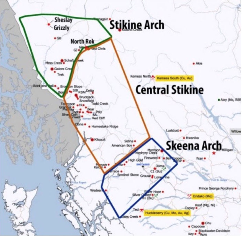 According to a presentation by Geoscience BC, “World class gold-rich deposits are associated with the Late Triassic, and Early Jurassic intrusive suites in NW Stikinia.” The non-profit research group also states that bulk tonnage copper/ gold/ silver porphyries (igneous rock consisting of large-grained crystals such as feldspar or quartz) in the Stikinia, and bonanza-grade gold and silver epithermal veins are associated with the early Jurassic period, such as the KSM, Snowfield and Brucejack deposits.