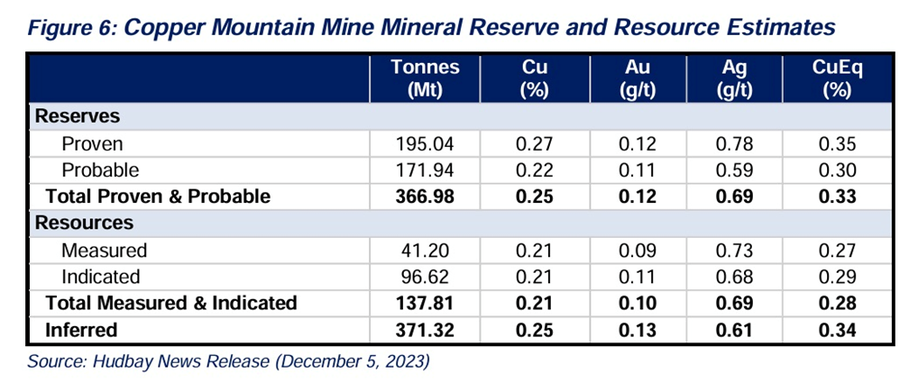 As of Dec. 1, 2023, proven and probable reserves were 367Mt at 0.25% Cu, 0.12 g/t Au, and 0.69 g/t Ag, with a copper-equivalent grade of 0.33%. (eResearch Industry Report, Feb. 29. 2024)