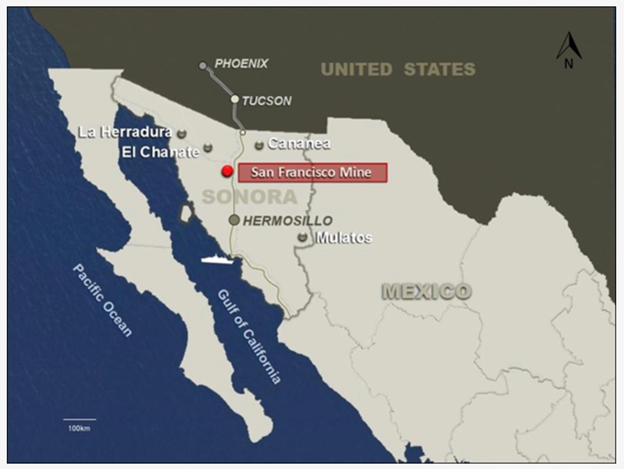Located 150 km north of Hermosillo, the capital of Sonora state, the 47,395-hectare property consists of two previously mined open pits (San Francisco and Chicharra) and associated heap leaching facilities.