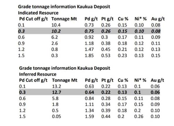 A 2013 historical RE at Kaukua amassed 10.4 million tonnes indicated, using a 0.1 grams per tonne (g/t) cutoff grade, comprising 0.73 g/t palladium, 0.26 g/t platinum, 0.15% copper, 0.10% nickel and 0.08% gold, plus an inferred resource of 13.2 million tonnes using a 0.1 grams per tonne (g/t) cutoff grade comprising 0.63 g/t palladium, 0.22 g/t platinum, 0.13% copper, 0.10% nickel and 0.06% gold.