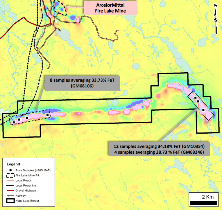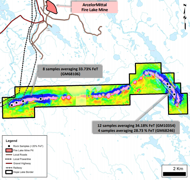 At Hydro, several historical rock samples in three separate zones were collected along an approximately 12-km trend of linear-style iron formation that has never been drill-tested. The samples average 32.5% Fe.
