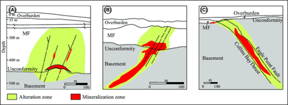 This deposit type belongs to the class of uranium deposits where mineralization is spatially associated with unconformities that separate Proterozoic conglomeratic sandstone basins and metamorphosed basement rocks. Although rocks of the Athabasca Group and the basal unconformity do not outcrop on the property, they likely once overlaid the basement gneisses and metapelites which now do, as the current erosional edge of the Athabasca Basin, and potential outliers, is about 50 km north of the property.