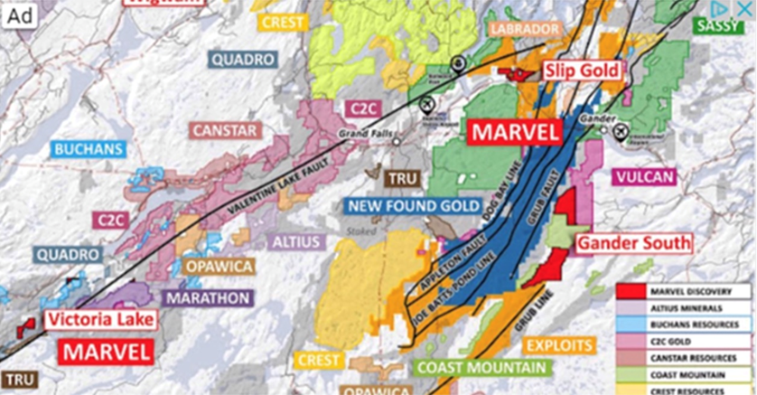 This week Marvel announced it has acquired an additional 53 mining claims at Victoria Lake comprising 1,325 ha, increasing its land position to 7,650 ha. The company says the acquisition is located along the Exploits Subzone and covers a large, highly prospective structural zone proximal to the Valentine Lake Shear Zone hosting Marathon Gold’s (TSXV:MOZ) Valentine Gold Project with resources of 4M oz. of gold…