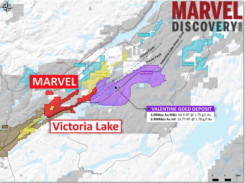 Victoria Lake Gold Project is host to interpreted extensions of the Valentine Lake Shear Zone and two major thrust faults, a wide structural corridor interpreted to play an integral part in the Marathon Gold Deposit.